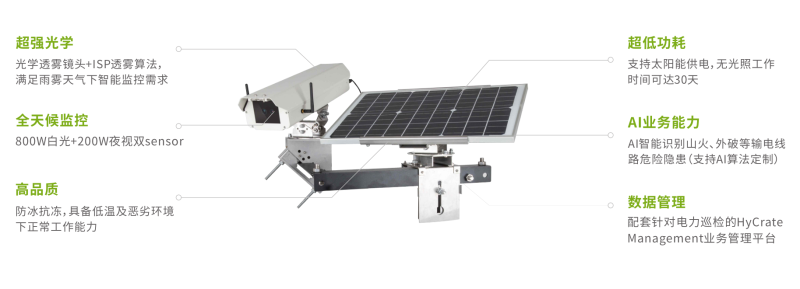 具备边缘计算能力的通道可视化智能终端,利用光学透雾镜头和ISP透雾算法,可以获取高对比高清晰的图像,保证在能见度低情况下的巡视效果。通过安装于杆塔上的通道可视化智能终端,采集输电通道环境信息,并识别输电线路山火、导线异物、外破等危险隐患,及时上传告警信息,辅助运检决策,有效保障输电线路运⾏安全。